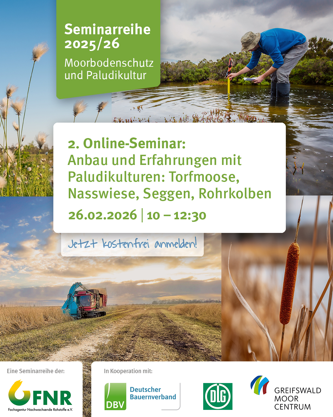 14/02/2026  Am 26. Februar 2026 bieten FNR und Greifswald Moor Centrum ein weiteres Webinar in der kostenfreien Onlinereihe "Moorbodenschutz und Paludikultur". Von 10.00 – 12.30 Uhr geht es um "Anbau und Erfahrungen mit Paludikulturen: Torfmoose, Nasswiese, Seggen, Rohrkolben".